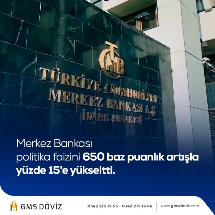 Türkiye Cumhuriyeti Merkez Bankası (TCMB) 27 ay sonra ilk kez faiz artırdı. TCMB Başkanı Hafize Gaye Erkan başkanlığındaki ilk Para Politikası Kurulu (PPK) toplantısında politika faizi 650 baz puanlık artışla yüzde 8,5'tan yüzde 15'e yükseltildi. Karar sonrası ilk kez Dolar/TL 24,41'i, Euro/TL kuru da 26,84'ü gördü.